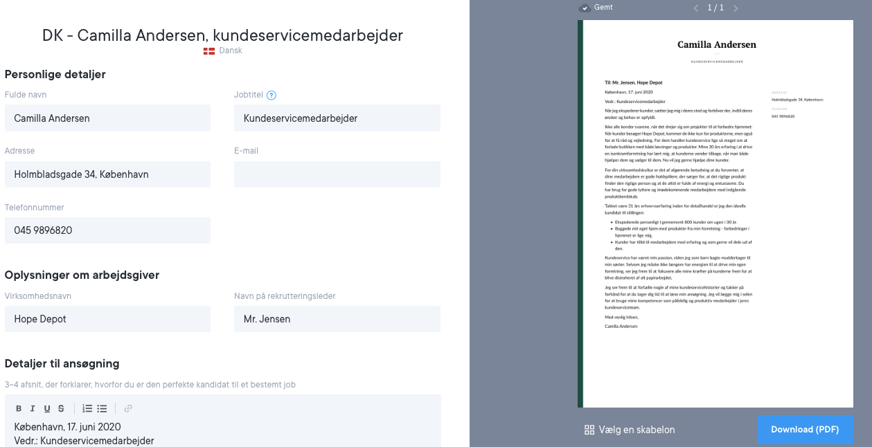 Du kan også downloade tekstfilen til din ansøgning gratis. Dette er fantastisk til hurtigt at oprette en ansøgning af høj kvalitet ved hjælp af vores værktøjer, der hjælper dig med at skrive din ansøgning og gemme den faktiske tekst på din enhed. Derudover tilbyder vi 18 professionelt designede og afprøvede ansøgningsskabeloner, som du kan matche til dit cv’s stil samt downloade i forskellige formater, herunder PDF-format.