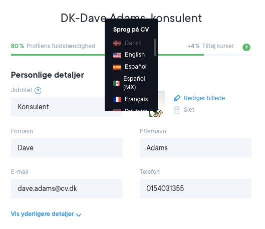 Ja, du kan til enhver tid ændre sproget på dit cv. På nuværende tidspunkt understøttes følgende sprog: engelsk, Русский, Nederlands, Español, Svenska, Dansk, Norsk, Deutsch, Français, Português, Italiano, Polski, čeština, Suomi, 中ės og Hindi.